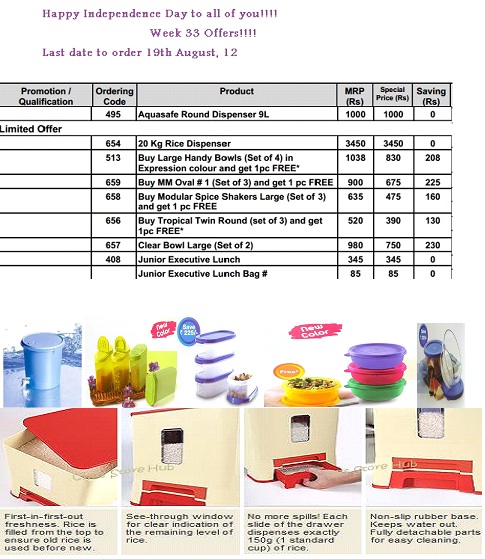 Offers on Tupperware products for November 2012 Big week (Week 47 and Week 48), starting from 18th Nov till 1st Dec. Offer on the below listed products will be available only during this week. Offers vary from week to week.
